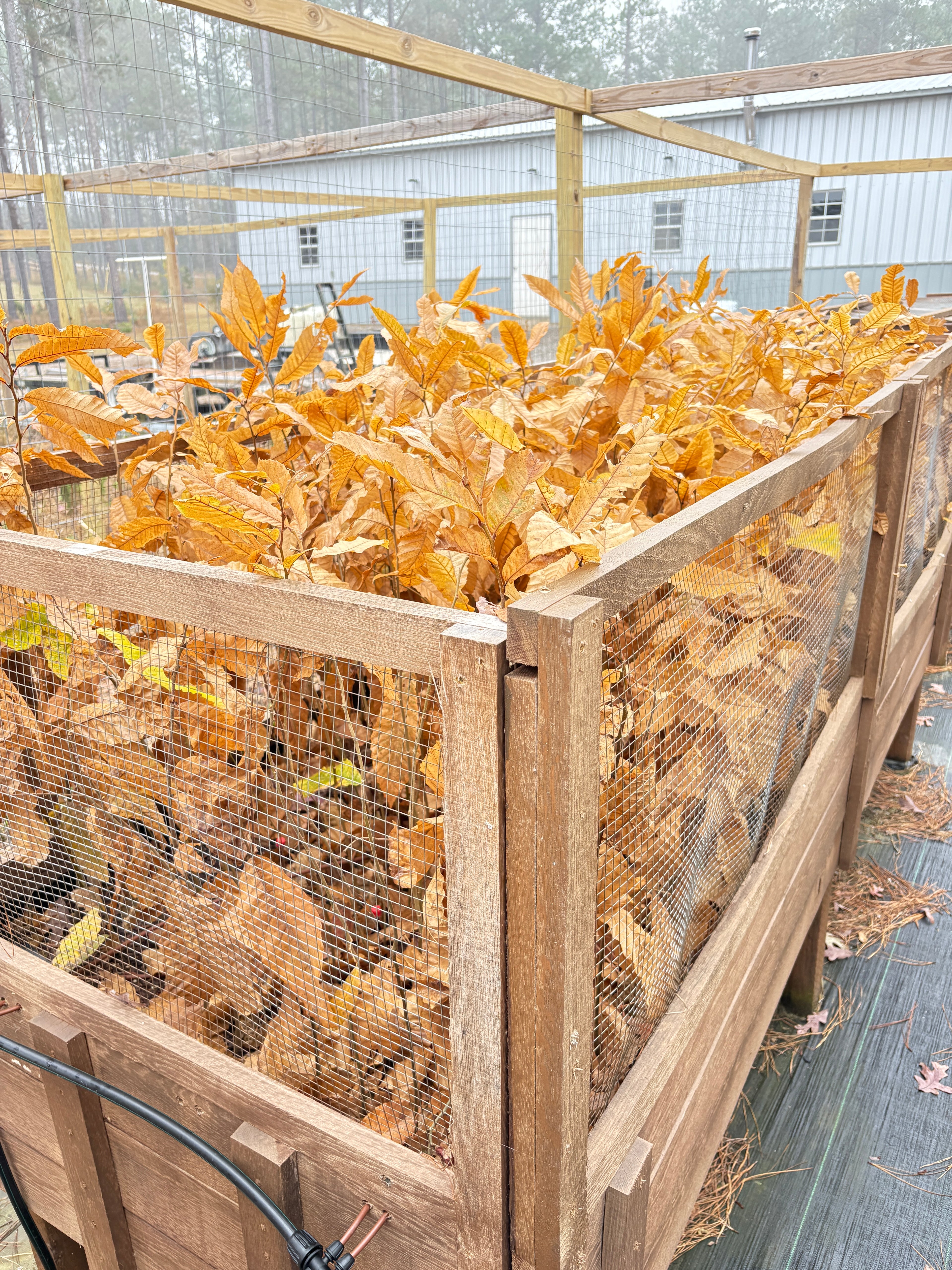 Bare-root chestnuts and oaks grown in air-pruning beds for stronger roots and better establishment.